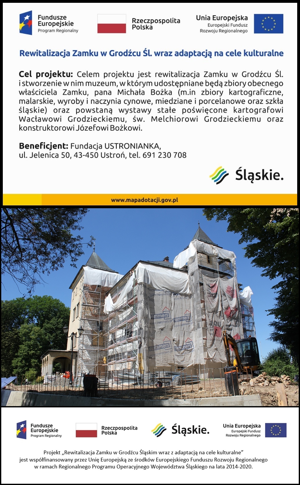Fundacja Ustronianka z Ustronia mająca w użyczeniu zamek w Grodźcu Śląskim należący do przedsiębiorcy Michała Bożka uzyskała dofinansowanie z Regionalnego Programu Operacyjnego Województwa Śląskiego na lata 2014-2020 (Europejski Fundusz Rozwoju Regionalnego). Dzięki dotacji będzie możliwa rewitalizacja zamku w Grodźcu Śląskim wraz adaptacją na cele kulturalne. Innymi słowy przeprowadzony zostanie generalny remont dzięki, któremu zamek zostanie udostępniony zwiedzającym. Kwota dofinansowania to 6 130 509,03 zł a wkład własny w tym projekcie Fundacji to kwota około 2 500 000 zł. Celem projektu jest rewitalizacja Zamku w Grodźcu Śl. i utworzenie w nim muzeum. Będzie to placówka eksponująca zbiory obecnego właściciela Zamku, Michała Bożka, wśród nich m.in.: malarstwo, rzeźbę, artystyczne przedmioty użytkowe, kartografię, przedmioty z porcelany oraz szkła śląskie. W muzeum dostępne będą także tematyczne ekspozycje stałe, poświęcone kartografowi Wacławowi Grodzieckiemu oraz konstruktorowi Józefowi Bożkowi. Przedmiotem projektu jest rewitalizacja obiektu na cele wystawienniczo-dydaktyczne wraz ze zmianą sposobu użytkowania wybranych pomieszczeń, przebudową wewnętrznej infrastruktury technicznej, w tym wymiana wszystkich instalacji, remontem murów oporowych tarasu, budową zbiorników wody pożarowej, utwardzonego placu do zawracania oraz przebudową infrastruktury technicznej- Zamku w Grodźcu Śląskim. Dzięki realizacji projektu powstanie nowe, niezwykle ważne na mapie kulturowej Śląska Cieszyńskiego miejsce, które przyciągnie turystów i entuzjastów historii z Polski i zagranicy. Zamek grodziecki wzniesiony został w XVI w. na miejscu wcześniejszej średniowiecznej warowni, której części stanowią piwnice zamkowe. Od czasu budowy po dzisiejszy dzień zamek nigdy nie był zrujnowany czy zniszczony. Zawsze miał właścicieli i dobry dach dzięki czemu jest dziś jednym z nielicznych polskich zamków, które od renesansu mają zachowaną pierwotną tkankę architektoniczną. Od XVI wieku właścicielami zamku były rodziny Grodzieckich, Marklowskich, Sobków, Larischów, Kaliszów, de Mara, Zoblów i Zamoyskich. W XIX w. zamek kupił bialski przemysłowiec Franz Strzygowski a w okresie międzywojennym Ernest Habicht. W czasie II wojny światowej na zamku była kwatera Wehrmachtu i szpital polowy, a po wojnie Instytut Zootechniki PAN. W 2004 roku zamek w Grodźcu wraz z zabytkowym parkiem stał się prywatną własnością ustrońskiego przedsiębiorcy Michała Bożka. W obiekcie przeprowadzono w ostatnich latach wiele niezbędnych prace remontowych i ratowniczych ze środków własnych przedsiębiorcy Michała Bożka. Między innymi wymiana pokrycia dachowego na miedziane i remont konstrukcji dachowej, remont elewacji i wymiana okien w oficynie zamkowej, renowacja zabytkowych parkietów oraz częściowy remont instalacji wodnej, grzewczej i kanalizacyjnej. Zamek dostosowany zostanie do potrzeb osób z niepełnosprawnościami chcącymi zwiedzić muzeum dzięki zastosowaniu zewnętrznej pochylni prowadzącej na poziom otwartej Loggi od strony południowej zamku. Ponadto zostaną utworzone stanowiska multimedialne w jednej z muzealnych sal, dostosowanej do wymogów osoby z niepełnosprawnościami, które zapewnią możliwość interaktywnego poznania zbiorów i zwiedzania sal wystawowych. Efektem realizacji projektu będzie rewitalizacja Zamku w Grodźcu - jednego z najpiękniejszych tego typu obiektów na Śląsku Cieszyńskim, mającego niezwykle istotne znaczenie dla dziedzictwa kulturowego, w szczególności dla dziedzictwa regionalnego, ze względu na swoją wartość historyczną oraz artystyczną. W odnowionych przestrzeniach zamkowych powstanie ogólnodostępne muzeum, które bogatą ofertą kulturalną przyciągać będzie miłośników historii i kultury z całego kraju i zagranicy. Projekt przyczyni się do upowszechniania dziedzictwa kulturowego Śląska Cieszyńskiego i propagowania jego kultury, historii oraz wzmacniana tożsamości społeczności lokalnej. Inwestycja przyczyni się do wzrostu atrakcyjności turystyczno-kulturowej regionu. Zamek w Grodźcu Śląskim jest zabytkiem wpisanym do rejestru Śląskiego Wojewódzkiego Konserwatora Zabytków (poz. A-141/76). W ramach projektu nie są finansowane zabytki ruchome (wyposażenie w ilości ponad 9 tys. eksponatów) oraz ich konserwacja, która będzie pokryta ze środków własnych. Fundacja Ustronianka mająca w użyczeniu zamek to organizacja pozarządowa założona z inicjatywy p. Zuzanny Bożek i p. Michała Bożka w 2015 roku. Przetarg publiczny na remont wygrała „Firma Budowlano-Konserwatorska Jarosław Woźniak” z Krakowa, która wcześniej pracowała przy renowacji zamku na Wawelu, zamku w Łańcucie czy zamku w Suchej Beskidzkiej. Umowę podpisano 1 grudnia 2020 roku i przystąpiono do prac. Planowane zakończenie remontu przewidywane jest wiosną 2022 roku.